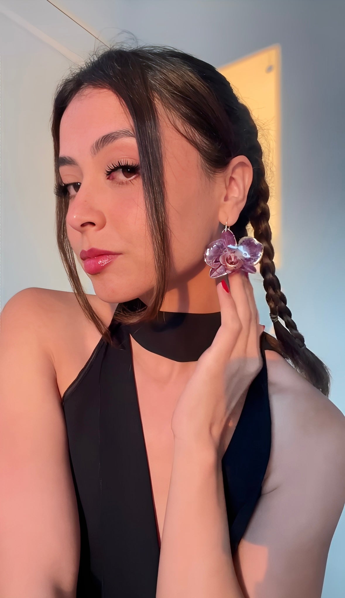 These earrings bloom in purple with coqueta white dots, rimmed in oro brillante that catches la luz at every step. She’s flirty, ligera, and made for la muñeca who walks like the whole calle is her pasarela.🌺