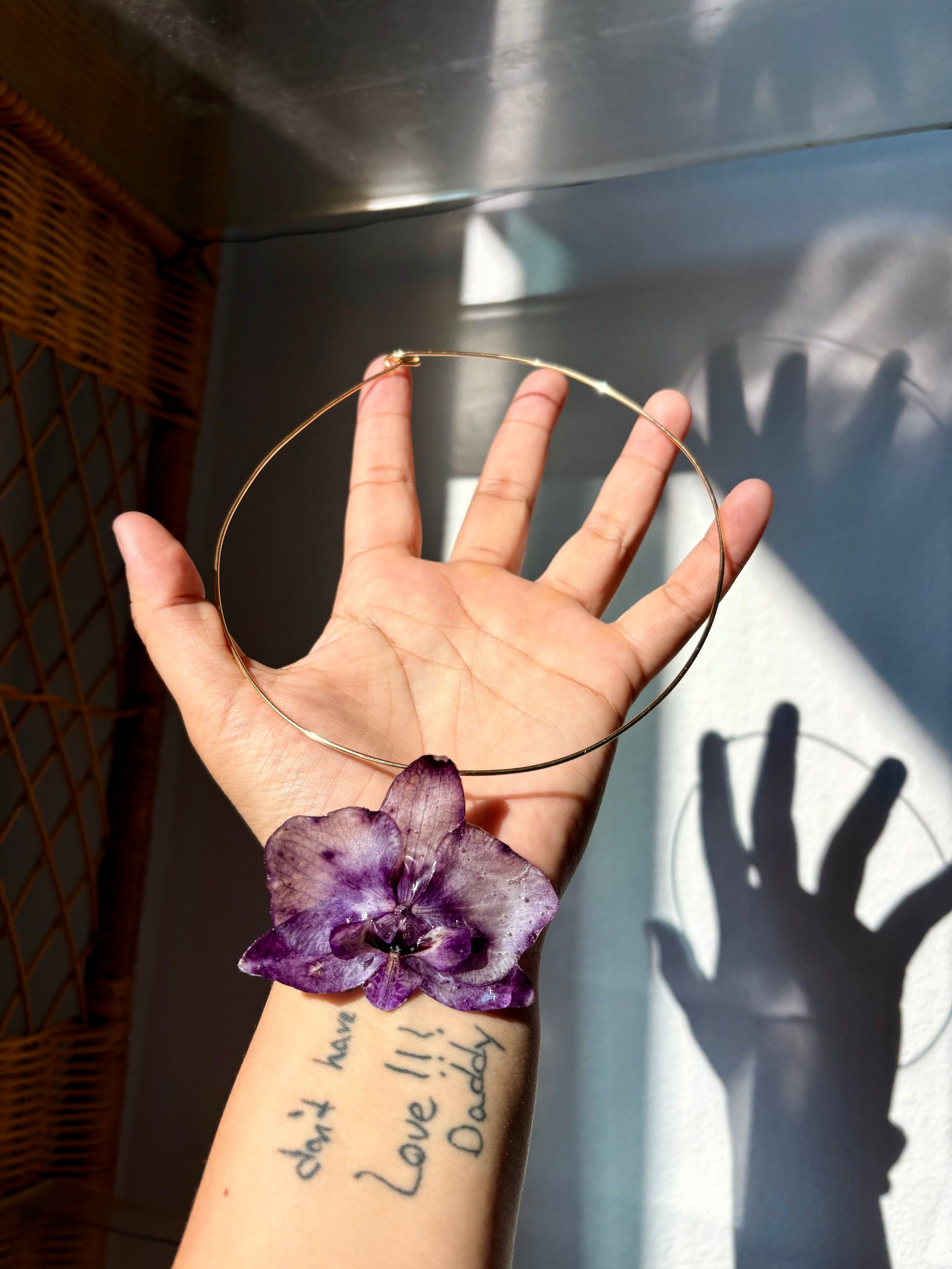 Orquídea Real is a bold yet minimal choker featuring a preserved purple orchid framed by sleek gold. She’s raw, tropical elegance the kind of piece that looks just as powerful with a slip dress as she does with cargos and gloss.